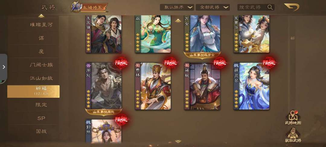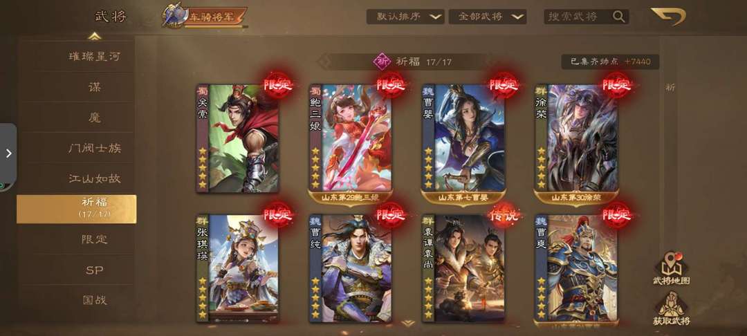 全祈福:郭照(动),薛灵芸(动)徐荣(文和)张琪瑛(动)曹纯(动)曹爽(动)龙凤(动.绘卷)潘淑(动)冯方女(绘卷)曹宪曹华(绘卷)周处(动)费祎(传) 鲍三娘(动) 曹婴(传), 蒋琬、关索,二袁,外加族钟琰、魔貂蝉
