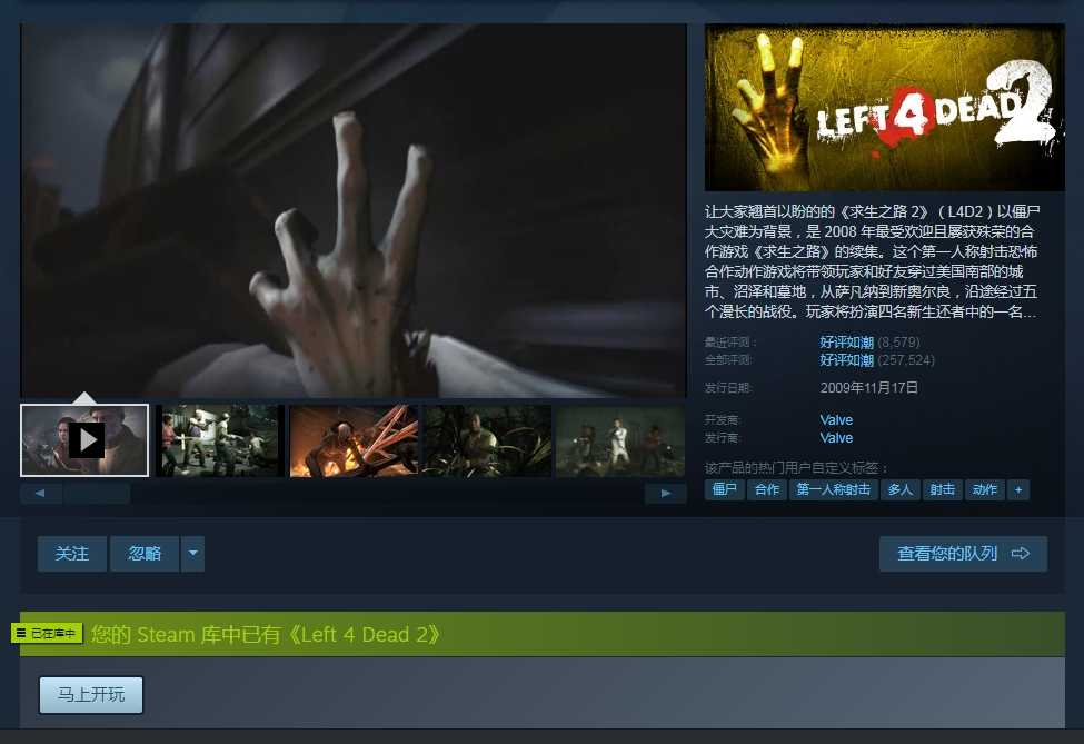 《求生之路2》是由Valve开发的一款以丧尸为主题的恐怖射击[12]类游戏,于2009年11月18日发行。