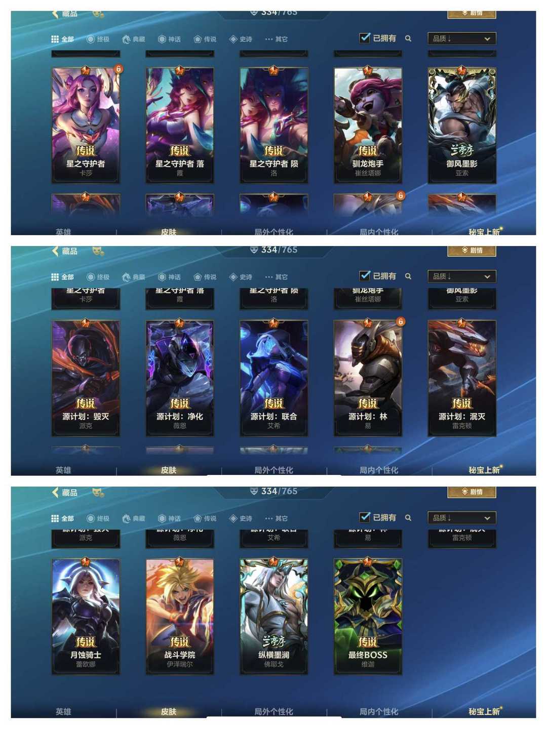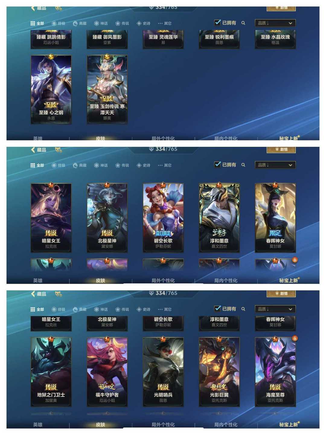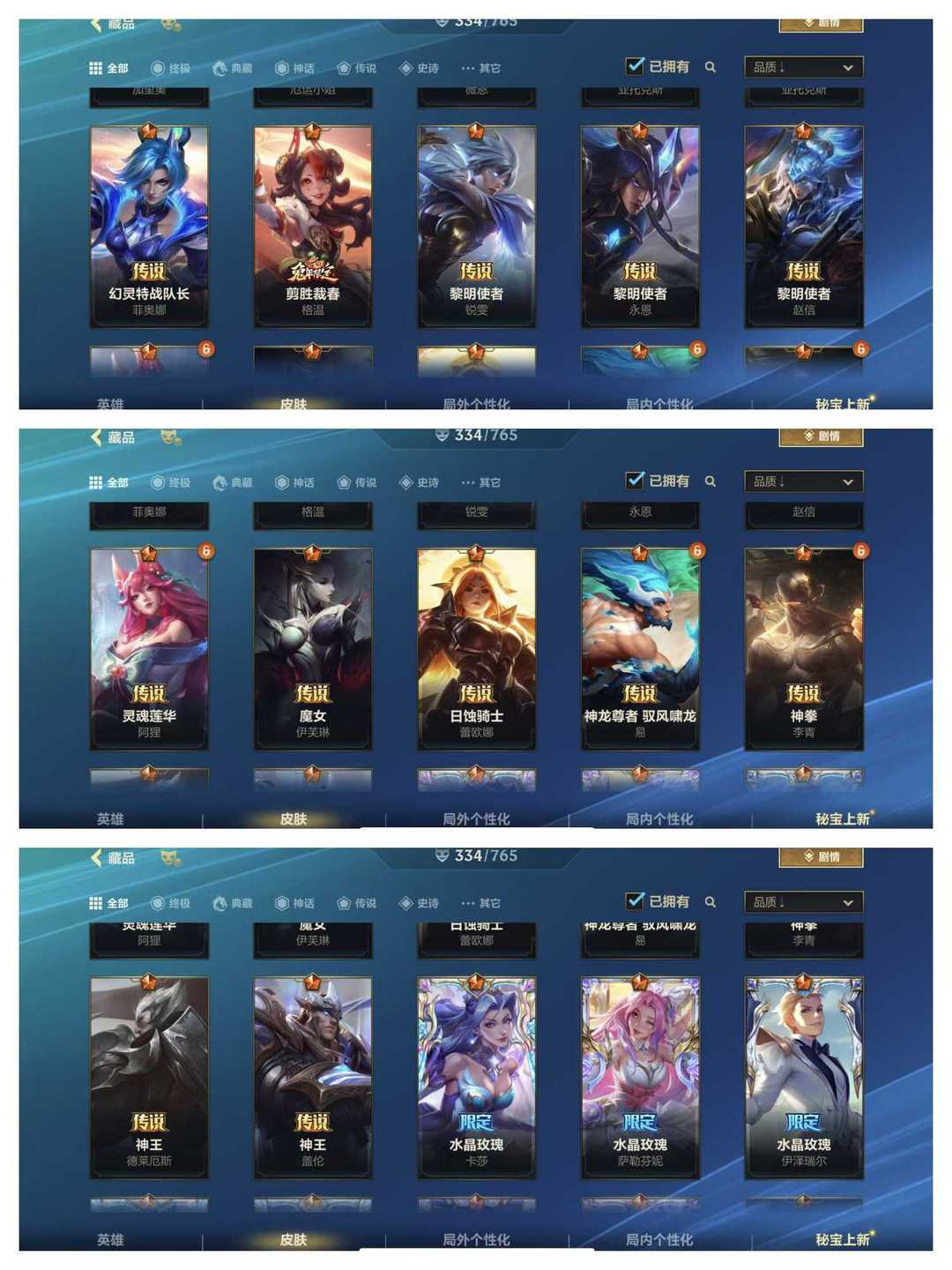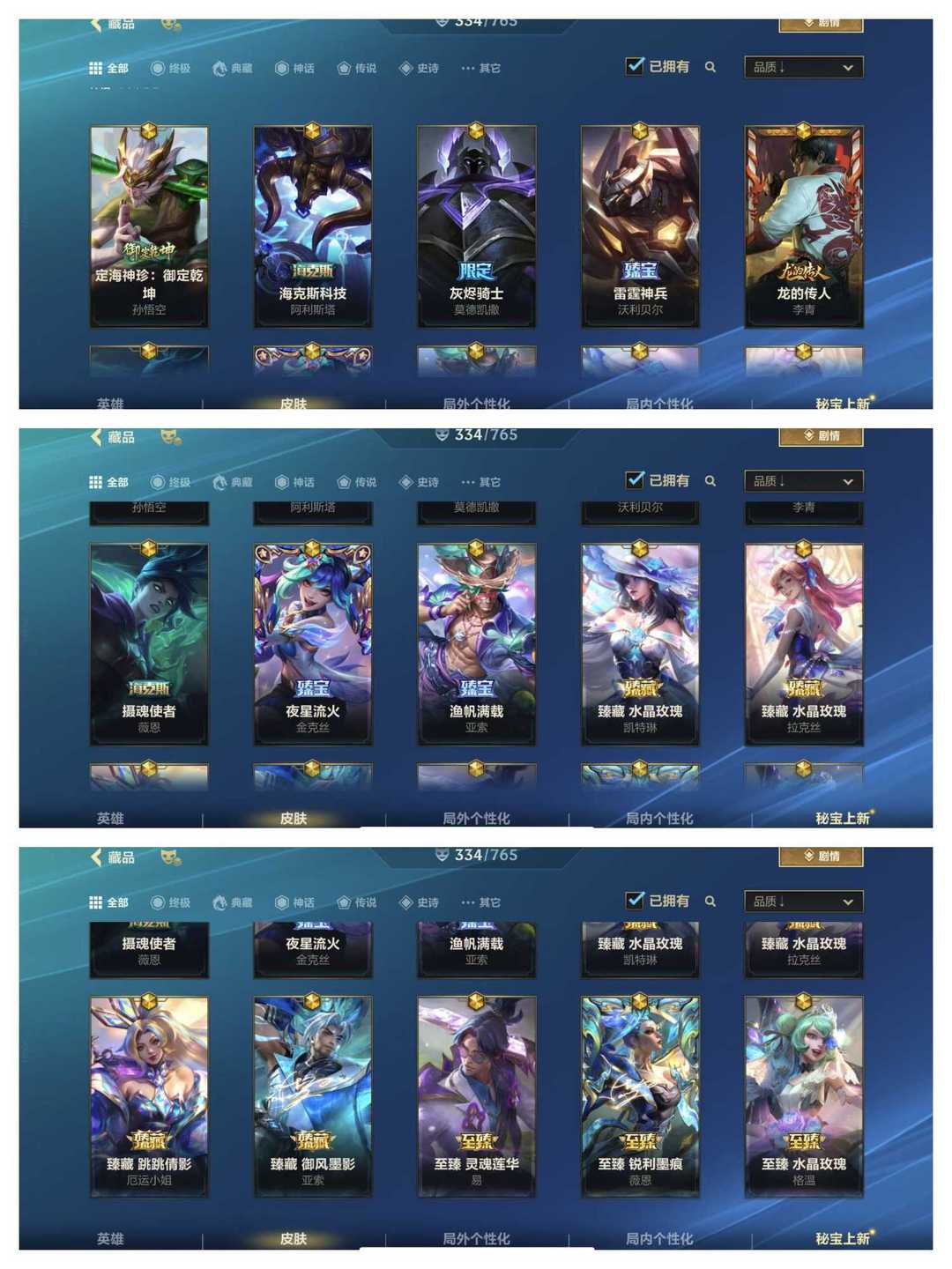 【魂】334皮可排位 全套水晶✨全套兰亭序✨臻藏水晶玫瑰女警拉克丝✨臻藏御风墨影亚索✨臻藏女枪等