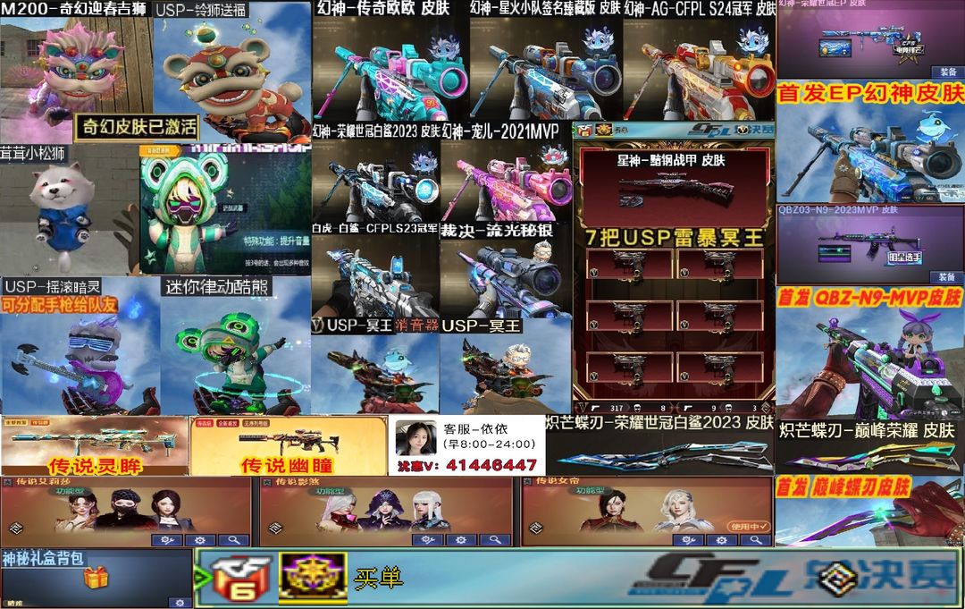 【装备道具】买单id❤EP幻神❤QBZ新N9❤巅峰荣耀蝶刃❤6把USP冥王❤黯钢星神❤AG24欧欧星火12幻神❤神秘礼盒金色昵称❤M200-奇幻迎春吉狮❤酷动律熊❤幻神星火小队❤幻神传奇欧欧❤AGs24幻神皮肤❤❤全音效卡❤八面凌龙满生化❤【装备道具】:281V 17王者 5炫金  传说辉光/传说夜影/传说灵眸/传说圣灵/传说梦魇/传说艾莉莎 传说女帝★幻神动感闪耀★幻神黄忠★幻神世冠白鲨★幻神宠儿★幻神冠军之幻★幻神巅峰荣耀★幻神周瑜★幻神AG冠军★幻神青鹤★幻神丹凤★M200-幻神(7)/M200-竞技荣光★王者幻神★幻灵套装/竞技荣光套装/荣耀世冠套装/裁决音效卡/极光音效卡/星神音效卡/幻神音效卡/黑骑士音效卡/黑龙音效卡/金色蔷薇音效卡/白虎音效卡/火麒麟音效卡/毁灭音效卡/雷神音效卡★雷神虎牙★白虎虎牙★炼狱虎牙★白虎大汉★幻神纸灯龙★金色蔷薇纸灯龙★qbz冠军★冠军之薇★冠军之特★冠军之刃★王者白虎★白虎电玩★星神璀璨★王者星神★白虎之魄★鲨臂★炽芒蝶刃★白虎小艾★关小雨/电竞教官-云悠悠/雨棠/影豹/