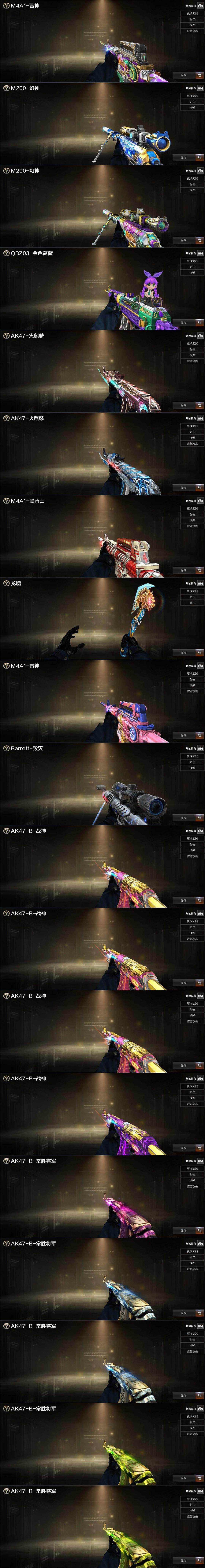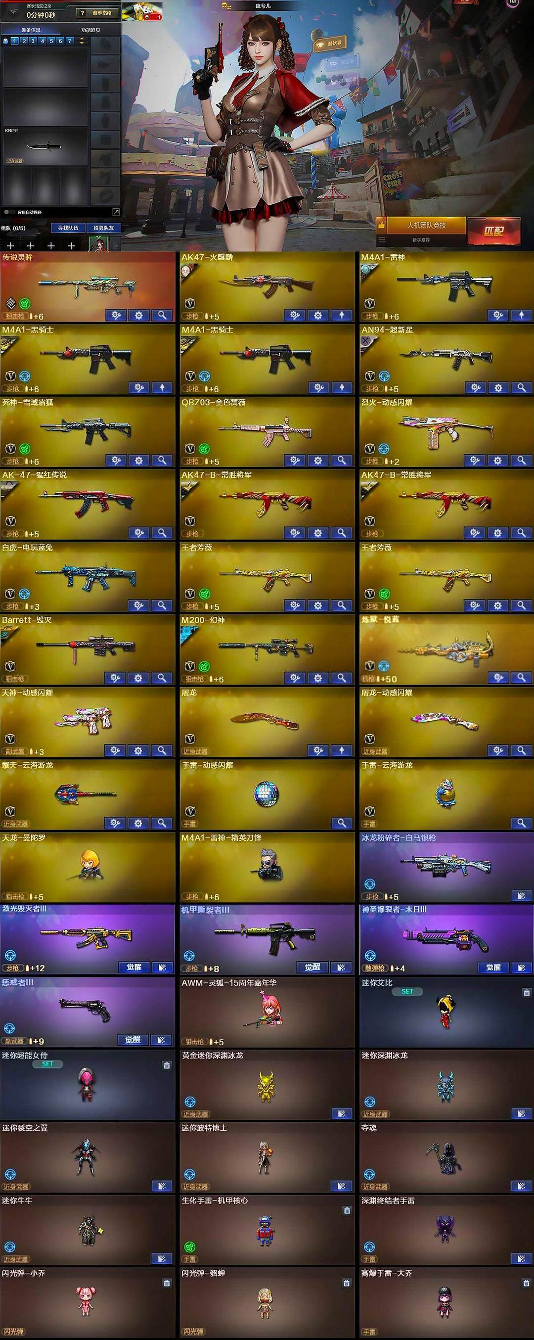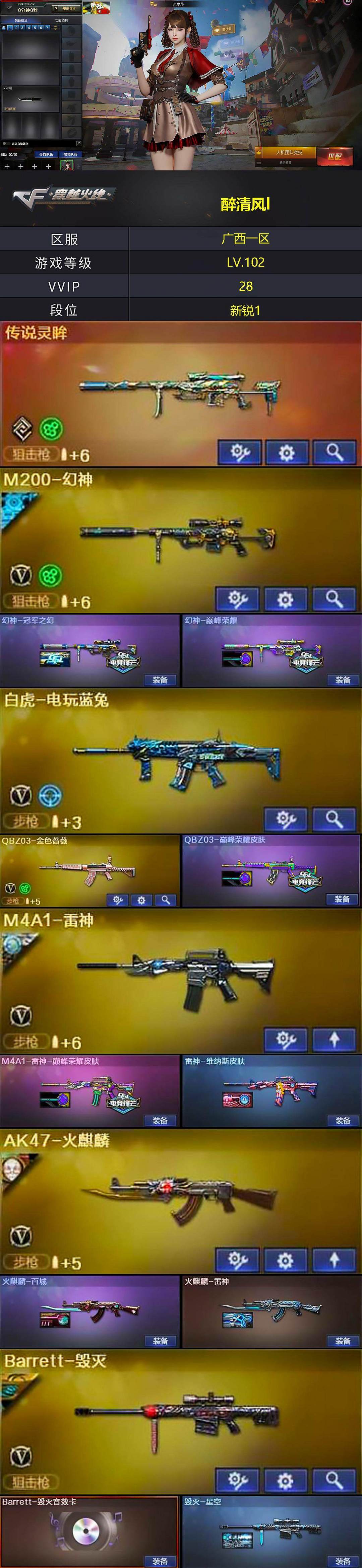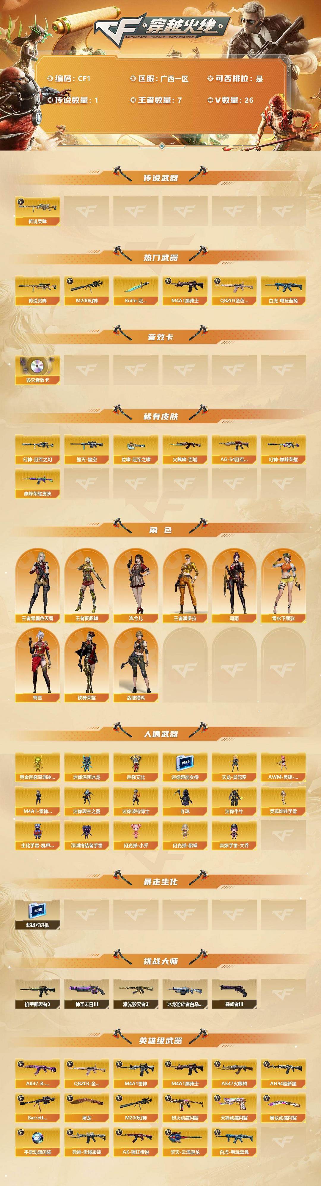南部战区-广西一区 传说灵眸 幻神-巅峰荣耀➕冠军之幻 王者芳微*2 白虎-电玩蓝兔 AN94超新星 QBZ金色蔷薇 巴雷特毁灭➕音效卡 黑骑士-白马银枪 雷神-巅峰荣耀 VSK金蚀 天神动感闪耀 屠龙动感闪耀 烈火动感闪耀 死神-雪域霜狐➕音效卡 司雨 岚兮人 战地猎狐 奇洋探员 乔伊教练 王者葵貂蝉 王者零国色天香 王者潘多拉 岚兮儿 司雨 29V